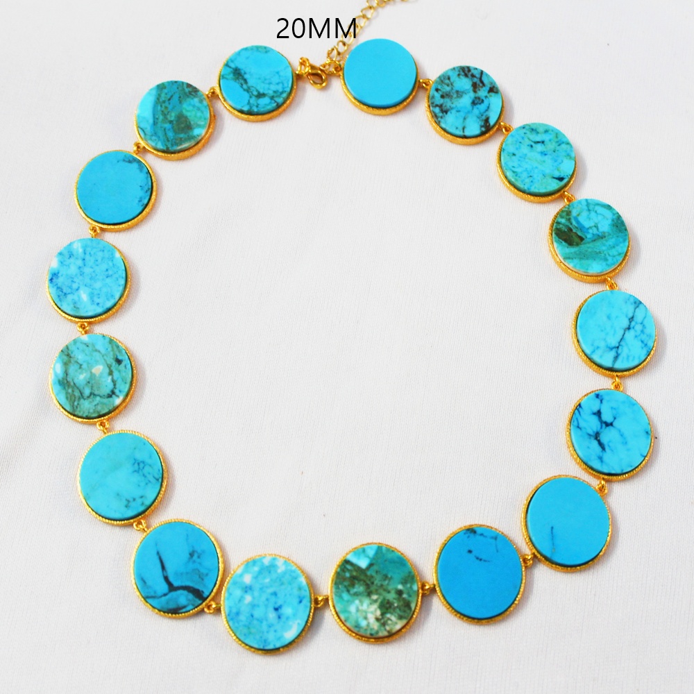 GOLD PLATED BRASS ROUND CERCLE 20MM HAND CUT POLISHED TERQUISEÂ STONE SEATEDÂ DESIGNER NECKLACE