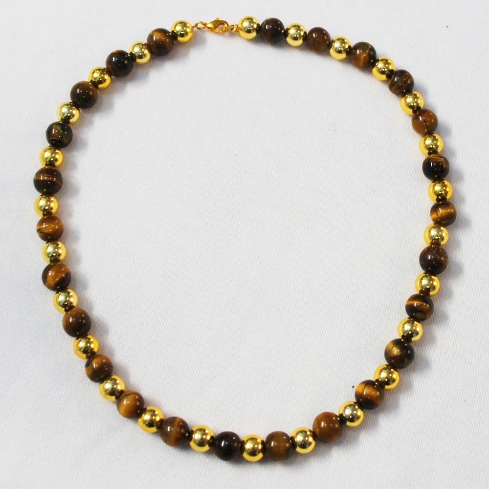 TIGER S EYE STONE AND GOLD PLATED BRASS BEADS NECKLACE