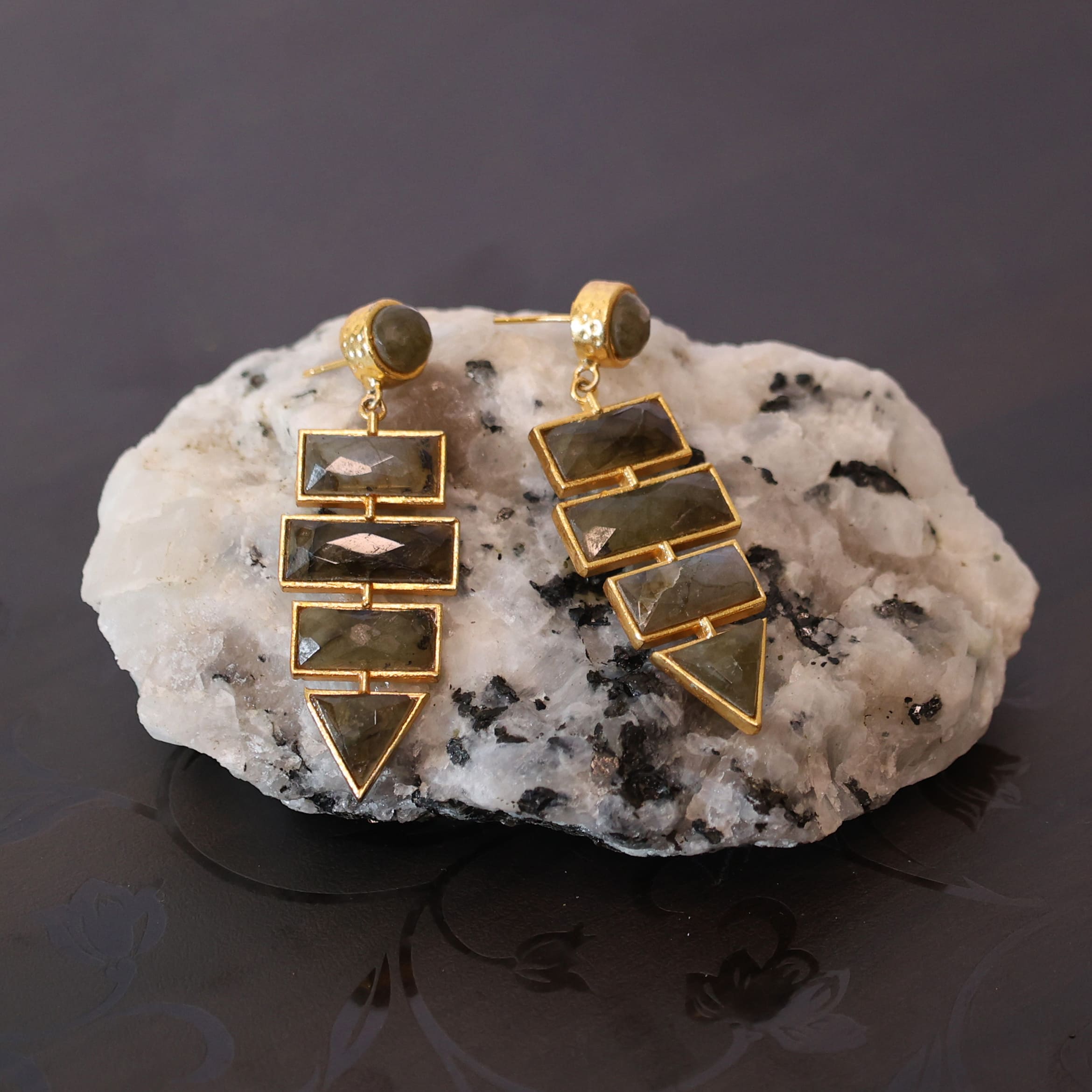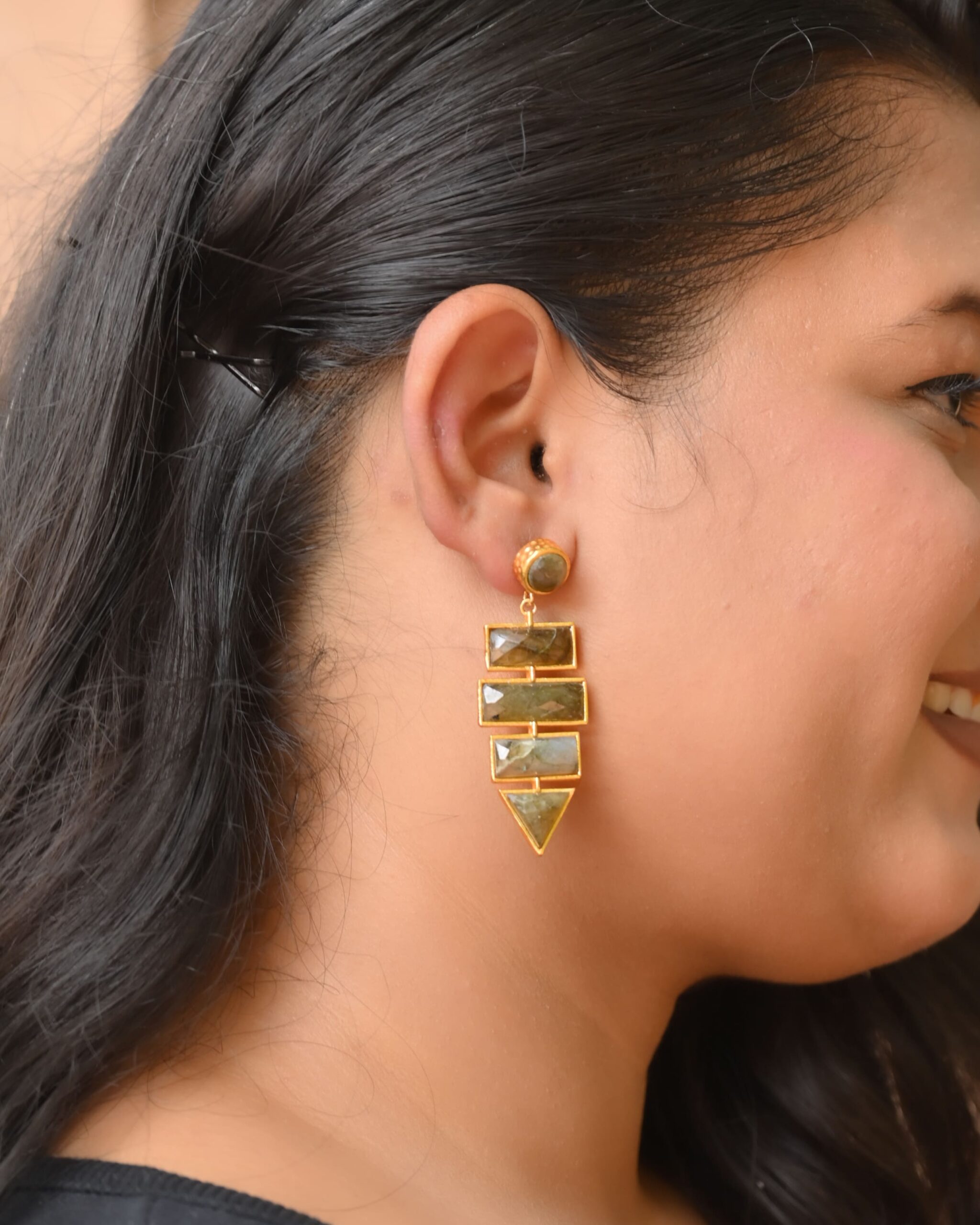 - DESIGNER EARRING GOLD PLATED NIKEL FREE WITH LABRADORITE STONE SEATEDOur Designer Earrings are a perfect blend of modern style and timeless elegance.