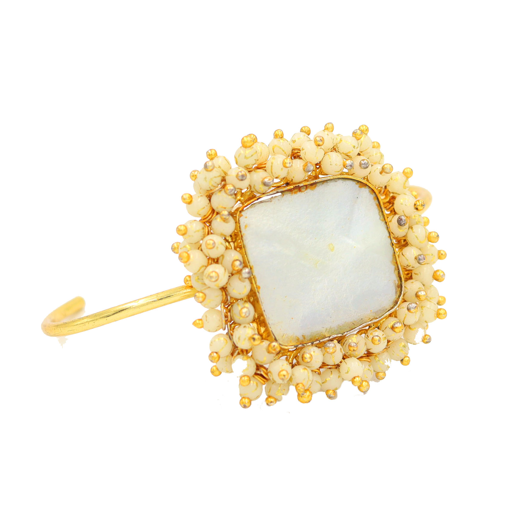 NIKEL FREE BRASS GOLD PATED CEOATED GLASS PEARL AND MOP STONE SEATED CUFF BRACELET