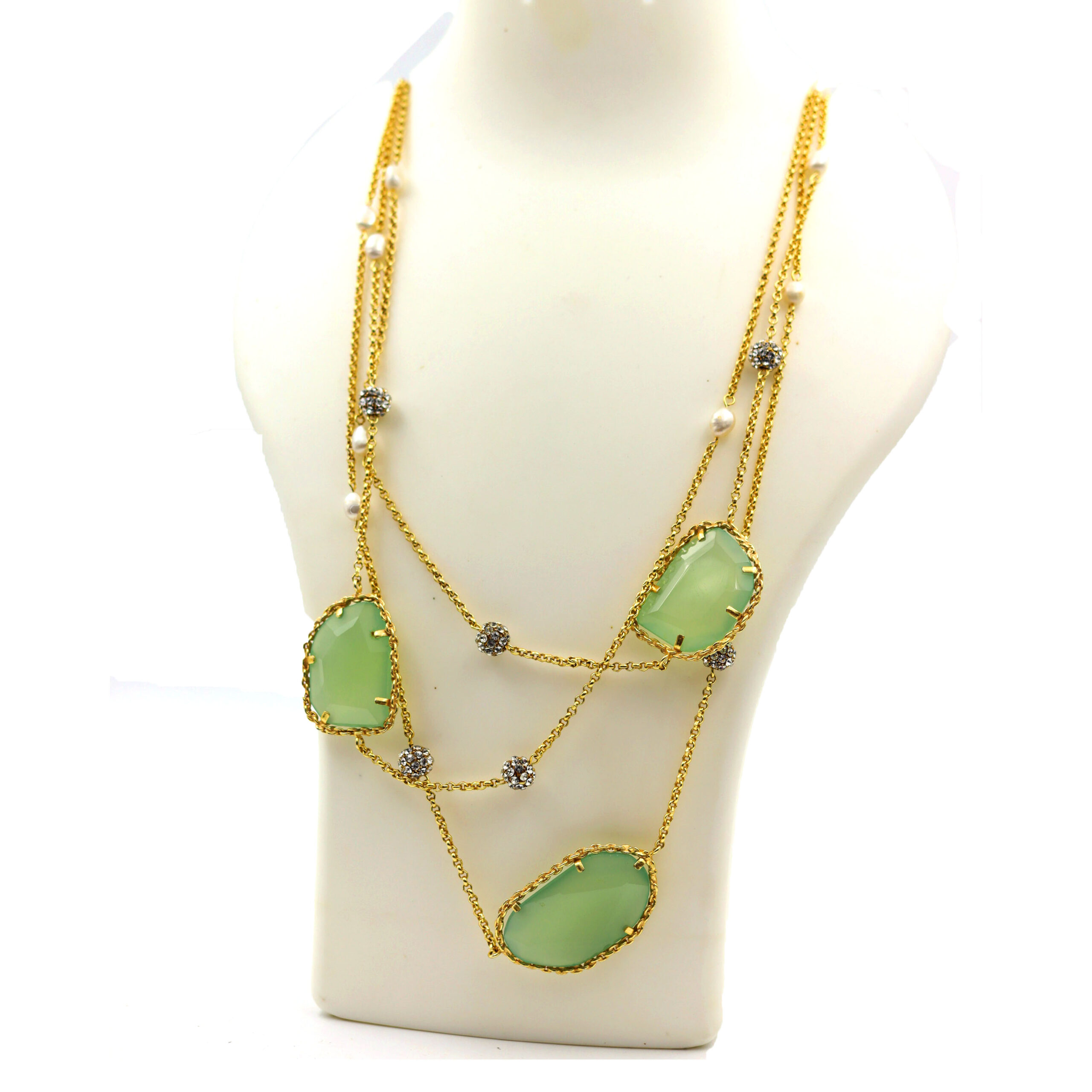 NIKEL FREE BRASS GOLD PLATED ECOATED WITH CZ BALLS SEATED AQUA CHALCI FANCY GEM STONES ANDÂ PEARL DESIGNERÂ NECKLACE